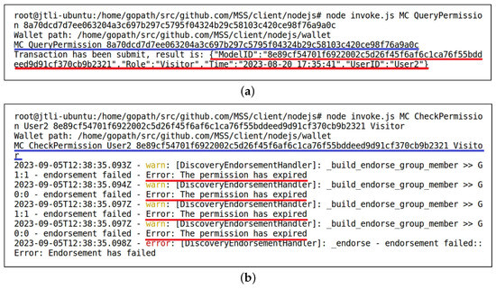 The vehicle detection model service is not open to the public. Considering model security, service providers need to control user access to the model. In the proposed solution, this is achieved through role-and-time-based permission management. After storing the model in the IPFS and the blockchain, User1 called the AddPermission() method of MC to grant User2 permission to use the model. Subsequently, User2 generated and verified a request to use the model by invoking the CheckPermission() method of the smart contract MC. Figure 7a illustrates the successful addition of a permission record through the QueryPermission() method of MC. During the query, the was used as input, as indicated by the blue underline. The result marked with a red underline confirms the existence of this permission record, indicating that User1 allows User2 to use the model. The time displayed here represents the expiration time of the permission. After successfully granting permission, User1 input the model information into the smart contract for model inference without providing this information to User2. When the permission expires, User2 called the CheckPermission() method again to verify the request to use the model, as indicated by the blue underline in Figure 7b, and the system displays that the permission has expired, as shown by the red underline.