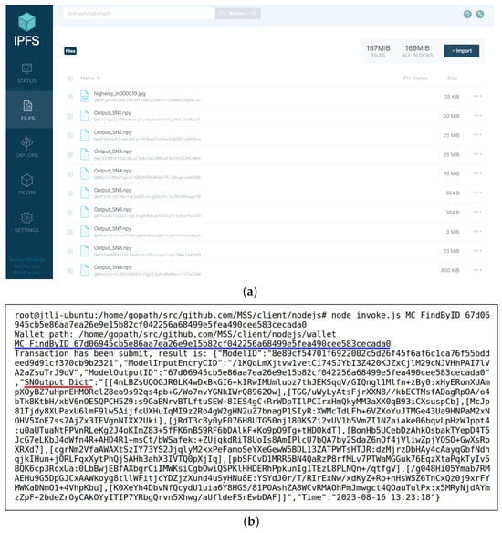 First, the vehicle detection model was well-distributed and stored based on the blockchain and the IPFS. The dispersion of model information increases the difficulty of obtaining the complete model information and prepares for tamper-proof checking, permission management, and inference in terms of data structure. The model owner initially divided the model into sub-networks. There are various ways to achieve this model division, and one of these ways is depicted in Figure 2. The model was divided into nine sub-networks. Subsequently, based on this division, the model owner uploaded these sub-network files to the IPFS, as illustrated in Figure 4a. In Figure 4a, SN1.h5, SN2.h5,…, SN9.h5 represent the files corresponding to the sub-networks, and beneath each file name is its CID. The interconnections among the nine sub-networks are defined using two lists: