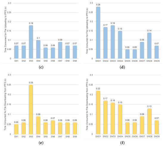 Sizes of sub-network files (a) and their inference result files (b) in the use case of Section 4.1. (c,d): Time consumed to upload these files to the IPFS. (e,f): Time consumed to download these files from the IPFS. (SN: sub-network; SNO: sub-network inference output).