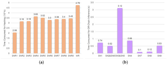 Time consumed for hashing during the model storage (a) and time consumed for sub-network off-chain inference (b) in the use case of Section 4.1. (SN: sub-network; SNR: sub-network record; MR: model record).