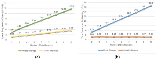 Trend of on-chain storage space required (a) and trend of time consumed for on-chain hashing (b) for model storage and inference as the number of sub-networks increases in the simulated experiment of Section 4.3.2.
