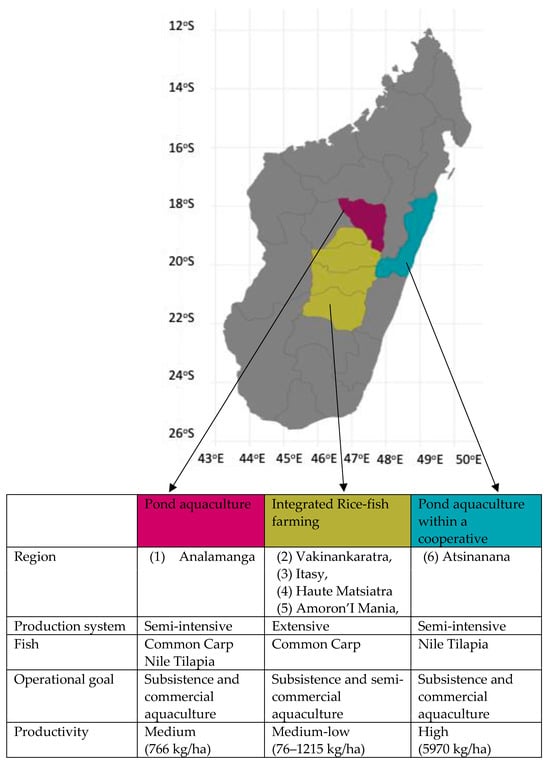 Madagascar, the fourth largest island globally, grapples with significant human development challenges and multidimensional poverty. The fisheries and aquaculture sectors accounted for 7% of the country’s GDP and 6.6% of exports in 2018, playing vital roles in the economy [28,29,30]. Freshwater aquaculture, particularly in inland regions like Antananarivo and rural areas, is essential in addressing undernutrition and enhancing the livelihoods of the local population. This sector relies on diverse methods, including small-scale pond and rice-fish aquaculture, and employs traditional practices and low-input technologies [31,32,33].