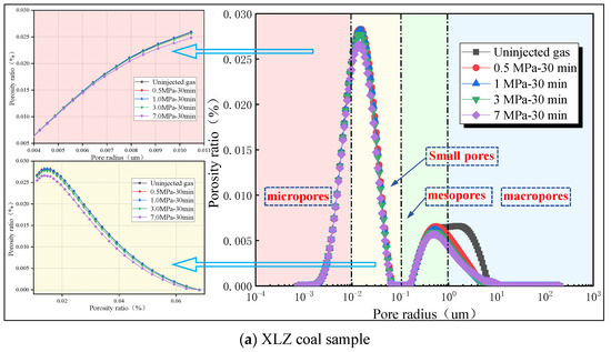 We aimed to clarify the pore size distribution in the mesopore structure, as well as the volume ratio changes. To facilitate the study of the pore structure, we considered four categories according to the Xoдoт B B method [54]: (1) micropores (φ ≤ 10.00 nm), which constitute the adsorption volume in coal; (2) small pores (10.00 nm ≤ φ ≤ 100.00 nm), which constitute the gas diffusion space; (3) mesopores (100.00 nm ≤ φ ≤ 1000.00 nm), which constitute a slow laminar penetration area; and (4) macropores (φ ≥ 1000.00 nm), which constitute the main penetration area. Therefore, the seepage pores are mainly large pores and mesopores, while the adsorption pores are mainly small pores and micropores.