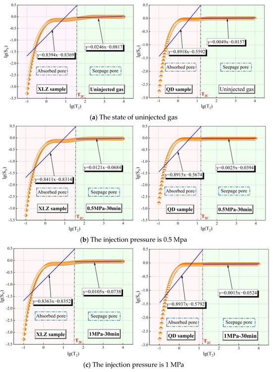 It can be seen from Figure 3 that the signal of the QD coal sample is much smaller than that of the XLZ coal sample, whether it is an adsorption pore or seepage pore, indicating that the porosity of the XLZ coal sample is larger than that of QD coal sample. During the experiment, the T2 spectrum of the XLZ coal sample changed significantly with the change in gas injection pressure. As shown in Figure 3a, under the same confining pressure, when the gas injection is started at 0.5 MPa pressure, the signal quantity of the adsorption pore section is almost unchanged, while the signal quantity of the seepage pore section is greatly less. With the continuous increase in gas injection pressure, the signal of the adsorption pore section still does not change much, and the signal of the seepage pore section decreases slowly. Until the gas injection pressure reaches 7 MPa, the signal of the adsorption pore section is significantly reduced, which mainly occurs in the pore range of 0.5–3.5 ms, while the signal of the seepage pore section is almost unchanged with the increase in gas injection pressure. We can see that the signal reduction rate of the seepage pore section is significantly higher than that of the adsorption pore section, indicating that the displacement effect of the seepage pore section is significantly better than that of the adsorption pore section.