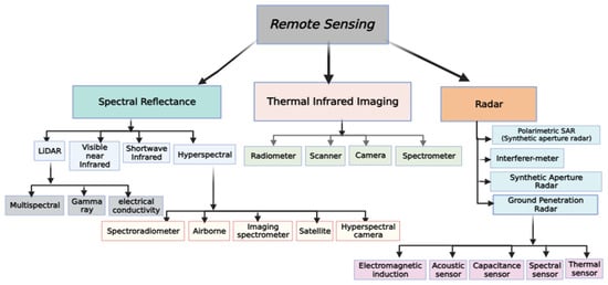RS techniques have significantly advanced in soil measurements using satellite, airborne, and ground-based methods for measuring soil erosion, identifying areas with high soil moisture content, and mapping soil nutrients [68]. It is also helpful in detecting soil contamination and evaluating soil fertility [69]. Figure 2 gives a thorough overview and stages of RS methods for soil analysis (spectral reflectance analysis, thermal infrared imaging, and radar remote sensing); tools for soil monitoring (e.g., LiDAR, hyperspectral, visible infrared, scanners, cameras, etc.) with various RS applications, as well as the RS parts used in soil monitoring.