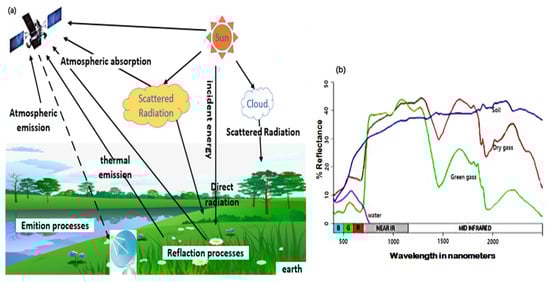 RS techniques such as thermal, radar, hyperspectral, and optical sensors are used for soil analysis to detect the characteristics of objects and materials from a distance during soil property measurement [21,95]. Most detection modes depend on photons tested at their related electromagnetic (EM) frequency [96] because the frequency and force of energy reflected or transmitted by the highlights in the scene being detected are usually identified and recorded by distant sensors. It should be noted that the electromagnetic radiation spectrum (EMR) comprises particles that travel in waves, and visible light is the most visible form of electromagnetic magnetic radiation.