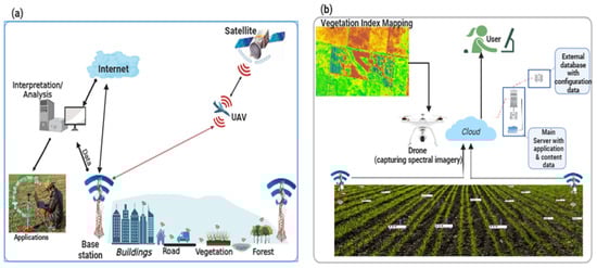 Applications of remote sensing: (a) integrated UAV concepts; (b) remote sensing system operation.
