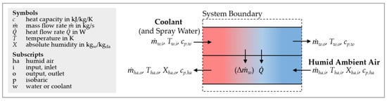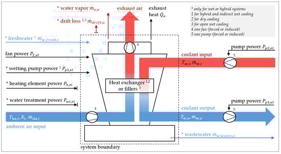 Generalized system boundary of different cooling tower types, based on Wenzel et al. []. The cooling tower transfers heat from the coolant flow to the ambient airflow.