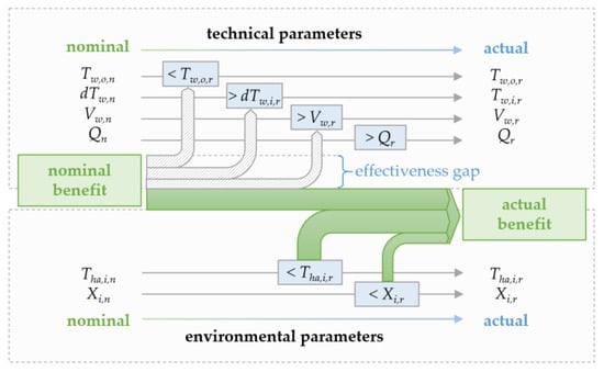 Difference between the nominal (n) and the actual (r) benefit, quantified as minimum airflow, due to the actual technical and environmental parameters. Environmental parameters include ambient temperature Tha,i and absolute humidity Xi. Lower heat transfer values imply an effectiveness gap. The technical parameters include the nominal coolant inlet and outlet temperatures Tw,i,n and Tw,o,n, the volume flow rate Vw,n, the resulting nominal heat load Qn, and the corresponding actual values (r).
