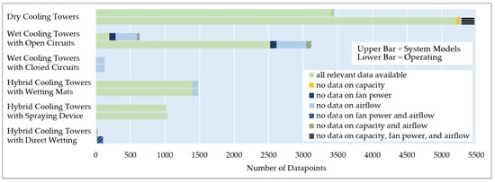 Firstly, we use the AirPI to assess the cooling towers in the dataset by Wenzel et al. [] to cover a broad range of different cooling tower models. The data include the six types of cooling towers described in Section 2.2. The dataset comprises 11,338 data points of 6730 cooling tower models by 27 manufacturers. Figure 4 provides an overview of the data availability and gaps.