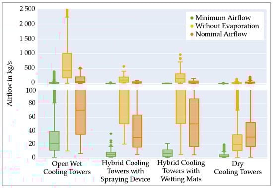 This study focuses on dry cooling towers, open wet cooling towers, and hybrid cooling towers with either wetting mats or spraying devices due to the lack of data for closed wet and directly wetted hybrid cooling towers. The data for these four cooling tower types comprise 11,101 data points and 6575 cooling tower models. We calculate the minimum airflow for all data points using Equation (3) and compare the minimum airflow to the nominal and theoretical airflow without evaporation. Subsequently, we calculate the AirPI for all cooling tower models based on the minimum airflow. Table S1 in the Supporting Material provides all corresponding data.