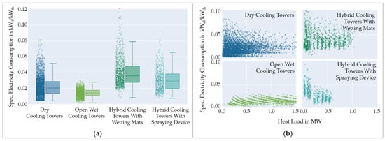 The efficiency of cooling towers is mostly represented by the ratio between consumed electricity and dissipated heat load in kWel/kWth. This ratio is called ‘specific direct energy consumption’ [] (p. v) or specific electricity consumption [] (p. 64), including the electrical final energy consumption, the nominal heat flow, the utilization ratio, and the operation hours. Nevertheless, these two parameters do not reflect the effect of temperature and ambient humidity.