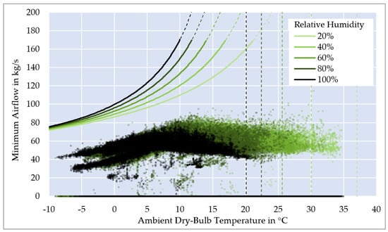 Before assessing the efficiency of the dataset’s cooling towers and the wet cooling system as a case study, we focus on the general factors influencing the benefit, quantified as the theoretical minimum airflow. This minimum airflow is proportional to the removed heat load cf. Equation (3). Nevertheless, the minimum airflow also depends on the required cooling temperatures and the outside conditions. For example, Figure 5 plots the minimum airflow for a heat removal of 4.8 MWth with a 20 °C inlet and 10 °C outlet temperature of the coolant.
