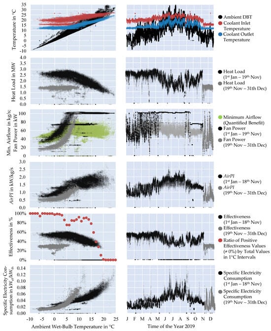 As part of the efficiency evaluation, we must regard how effectively the cooling tower achieves the desired heat transfer because the actual values differ from the nominal values. Regarding the operation in practice with varying ambient conditions, we examine to what extent the cooling tower matches the manufacturer’s nominal (n) heat transfer values (nominal heat load Qn, nominal volume flow rate Vw,n, nominal coolant inlet temperature Tw,i,n, and nominal coolant outlet temperature Tw,o,n). If the ambient WBT approaches the required coolant outlet temperature Tw,o,n, the targeted cooling temperature is hardly achievable—or not at all if the WBT exceeds the required cooling temperature. As a result, the real (r) coolant outlet temperature Tw,o,r increases, and the targeted cooling service remains unachieved. In this case, the effectiveness, generally defined as the actual–nominal ratio of actual to targeted benefit, is below 100%.