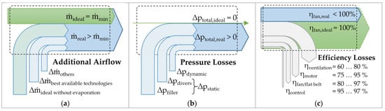 Based on the idea of the physically ideal reference process in exergy analysis and the physical optimum method (cf. Section 1.2), there is a physically ideal situation in which the cooling tower serves its air-moving purpose with minimum effort: The heat load is theoretically removable with a specific minimum airflow rate in the idealized case, where the following applies: