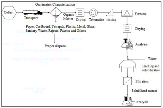 The preparation of the solubilized extract was carried out as recommended by NBR 10.006/04 [36], as shown in Figure 3. Sample preparation was carried out at the Laboratory of Pilot Installations for Water and Sludge Treatability (FUPA). Sufficient samples were prepared for all the analyses foreseen in this work. The complete collection of material carried out in all sectors was homogenized, considering the grouping of sectors into regions.