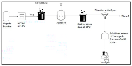 After the collections, the gravimetric characterization of solid waste was carried out, in which it was classified and separated into paper, cardboard, Tetra Pak, rigid plastic, malleable plastic, metals, glass, organic matter, sanitary waste, fabrics and others wastes. The proportion of each of these residues was calculated. Subsequently, the organic fraction of the residues was subjected to drying at 105 °C, crushing, sieving through 6-to-9-mesh sieves and freezing at a temperature below 0 °C. Subsequently, the material was thawed at a temperature of 42 °C, and this was also the temperature at which the procedures for obtaining the solubilized extract and the analyses were carried out.