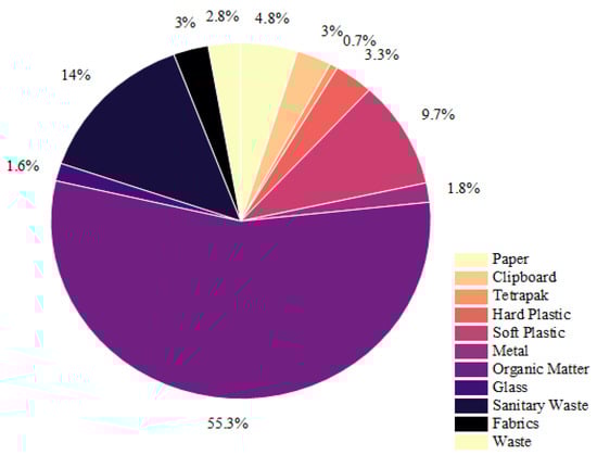 After raising the values, it is possible see that the values of organic matter represent more than 50% of the total values of the fraction of solid waste, followed by the fraction of sanitary waste (14.30%) and malleable plastic (10%). These first three represent almost 80% of the total mass of collected waste (Figure 4).