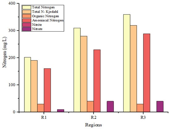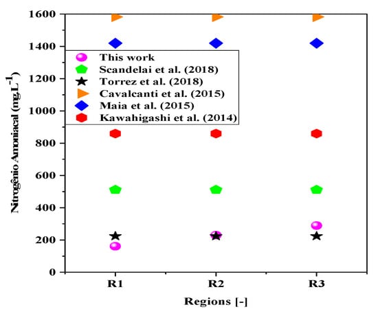 A comparison of the results obtained with the values of ammoniacal nitrogen and nitrate was carried out, in which it was possible to verify low values of ammoniacal nitrogen, when compared with that raised by other authors. The information is closer to the analyses carried out by [16] in which the values for Regions 1 (161 mg·L−1), 2 (230 mg·L−1) and 3 (289 mg·L−1) are close to the 224 mg·L−1 that is presented in the aforementioned author’s research (Figure 11).