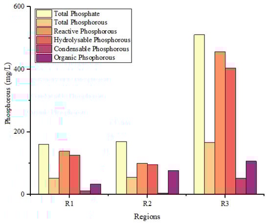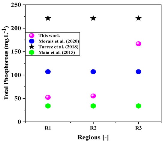 When compared to other research, the results of the analyses of the phosphorus series show the existence of proximity with the raised values. For Regions 1 and 2, phosphorus concentrations are consistent with those of the analyses performed by [19], at a value of 34 mg·L−1. Meanwhile, the results of the analyses of the solubilized extract for Region 3 are closer to the values of [16,43], in the order of 221.19 mg·L−1 and 107.03 mg·L−1, respectively (Figure 13).