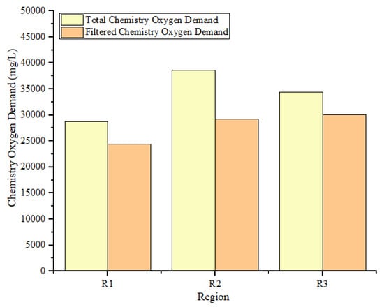 After the results of the analyses, high values of chemical oxygen demand were verified in the solubilized extracts from all regions; since the residue comes from organic matter, high values of related parameters are expected. Both for the total chemical oxygen demand and for filtered chemical oxygen demand, the highest values are presented in the solubilized extract of Region 2 (Figure 8).