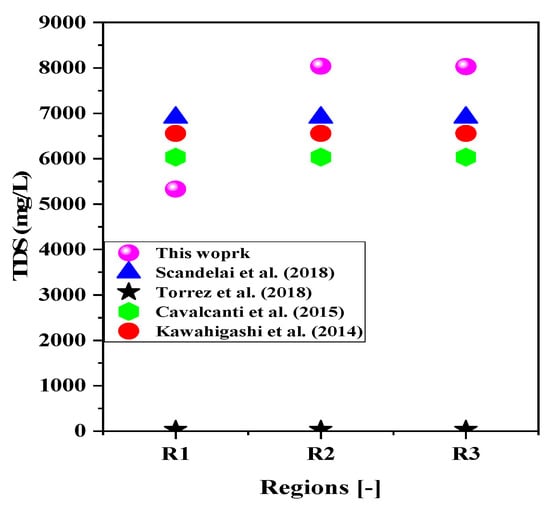 Regarding the solids content, the values of total dissolved solids (TDS) were observed to be high for Regions 2 and 3, being 8040 and 8030 mg·L−1, respectively, as shown in Figure 10. The results of the physical–chemical analyses for obtaining solids demonstrate the proximity with the research carried out by [18] for Region 1 (6035 mg·L−1) and for Regions 2 and 3, the results are closest to the values obtained by [15], with solid concentrations in the order of 6903 mg·L−1 (Figure 10).