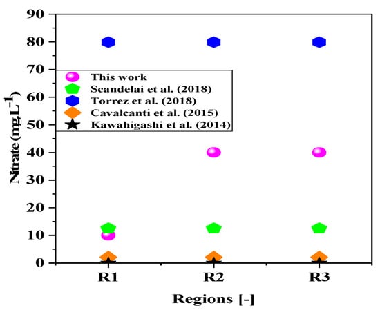 For the nitrate values, it was possible to verify that the nitrate concentrations for Regions 1 (10 mg·L−1), 2 (40 mg·L−1) and 3 (40 mg·L−1) are similar to the results of [15] (12.50 mg·L−1) for Region 1 and the results of [16] (79.92 mg·L−1) and [15] for Regions 2 and 3, where it approaches the mean value between the two concentrations verified (Figure 12).