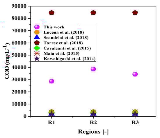 When comparing the COD values with those found by other authors, discrepancies between the maximum and minimum values are observed. The by-products arising from the degradation of solid waste, which generate leachate, have variable and complex characteristics, represented, in most cases, by substantial amounts of dissolved organic acids, biochemical oxygen demand and chemical oxygen demand [43]. Except for [16], the COD concentrations obtained are higher than those of the authors consulted. Therefore, the COD values for the solubilized extract of the residues are in an average range when compared with the sources consulted in this work; however, considering the proximity to COD concentrations of leachate from landfills, it makes it possible to detect the environmental risk represented by the solubilization of solid organic waste (Figure 14).