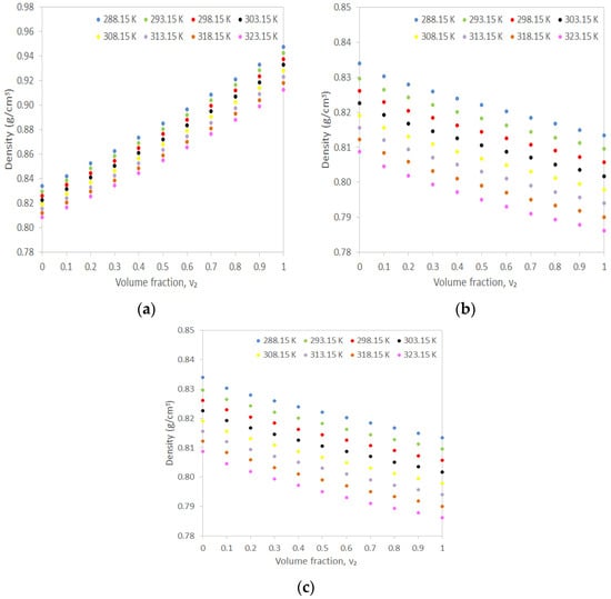 Figure 4 illustrates a comparison between the experimental blend density data (at 288.15 K) and the density values calculated using the investigated models (Equations (1) and (2)). These results show that the values obtained using Equation (2) are consistently similar to the experimental values.