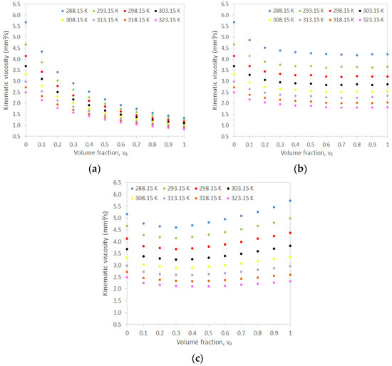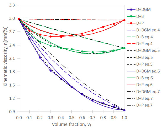 A comparison between the measured kinematic viscosity values of the binary blends and the values obtained with Equations (4)–(7) at 313.15 K is presented in Figure 7.