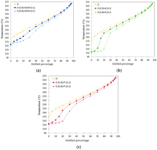 Distillation curves for studied blends: (a) diesel fuel + DGM; (b) diesel fuel + n-butanol; (c) diesel fuel + n-pentanol; 0.1, 0.2, 0.8, 0.9 are the volume fractions.