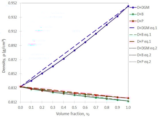 Taking into account all the above-mentioned practical aspects, the main objective of this study was to determine the influence of three oxygenated additives with different oxygen contents, DGM, n-butanol, and n-pentanol, on the density and viscosity properties of their derived fuel blends. A comprehensive search of the literature on the use of diesel blends with DGM did not reveal any study related to the properties of such mixtures. N-butanol and n-pentanol were chosen due to their potential use as substitutes for diesel fuel. Considering this possible application, we conducted this investigation to characterize these blends and predict their key features by modeling their properties using empirical correlations. The mathematical models used for predicting blend density and viscosity are widely adopted in previous studies [41,47,48,49,50,51,52]. Studying these systems should provide important insights into the mixtures that meet the quality standards for diesel fuels.