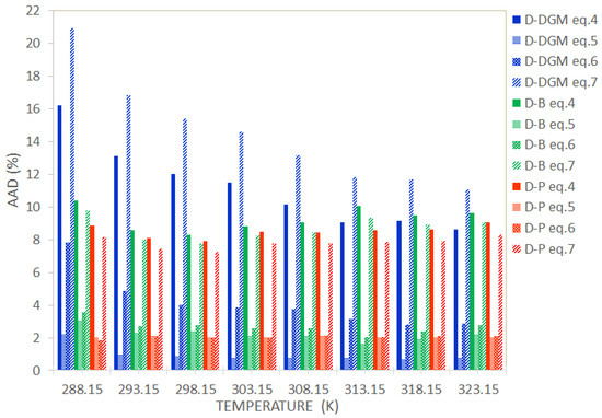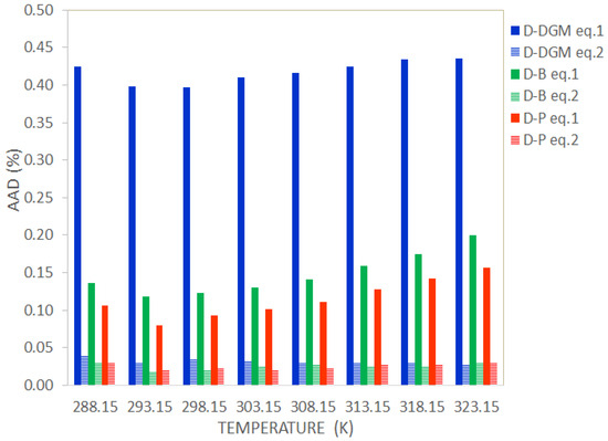 Plot of average absolute deviation AAD versus temperature calculated using Equations (1) and (2) for diesel + DGM, diesel + n-butanol, and diesel + n-pentanol blends at various volume fractions.