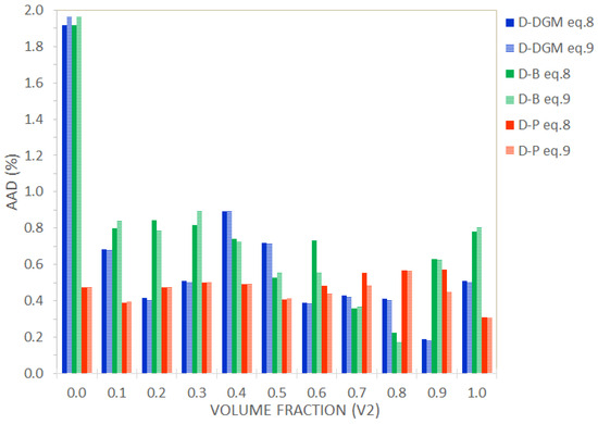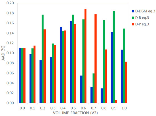 Figure 9 depicts a plot of AAD versus volume fractions calculated using Equations (8) and (9) for the diesel + DGM, diesel + n-butanol, and diesel + n-pentanol blends at various temperatures.