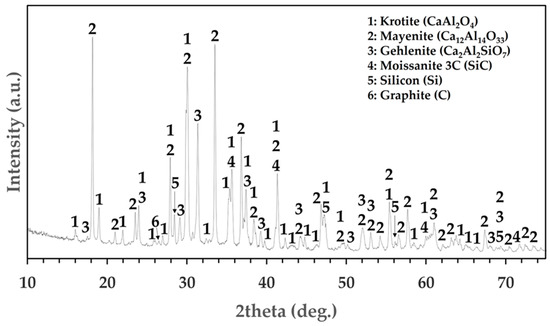 The results of the XRD analysis are presented in Figure 2 and Table 2. According to our findings, the main constituents are krotite (CaAl2O4), mayenite (Ca12Al14O33), gehlenite (Ca2Al2SiO7), and amorphous material. Furthermore, silicon metal (Si) and moissanite-3C (SiC) are present in minor quantities, while a trace amount of graphite (C) is detected.
