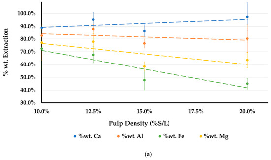 The % wt. extraction of a metal (Me = Al, Ca, Si, Mg, Fe) in the PLS and the washing solutions is defined as the mass of each metal dissolved in solution divided by its corresponding mass contained in the slag before leaching, as described by Equation (2).