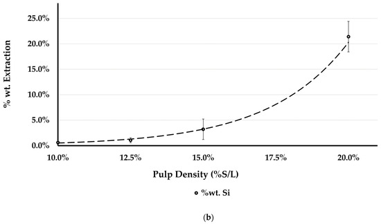 Concerning the dissolution of impurities, according to the extraction curves of Figure 3a,b, these can be divided into three groups: (a) Ca, (b) Mg and Fe, and (c) Si. The case of Ca was already addressed earlier in this section. The second group of impurities, Mg and Fe, behave similarly with increasing S/L ratio, as shown in Figure 3a. Their % wt. extraction values are lower than those of Ca and Al, and they decrease with increasing S/L ratio. Investigation of the behavior of these impurities is beyond the scope of the present research that focuses on the behavior of Al and Si and will be treated in future optimization studies of the process. Finally, the following section focuses on the behavior of Si, which is the most important impurity.