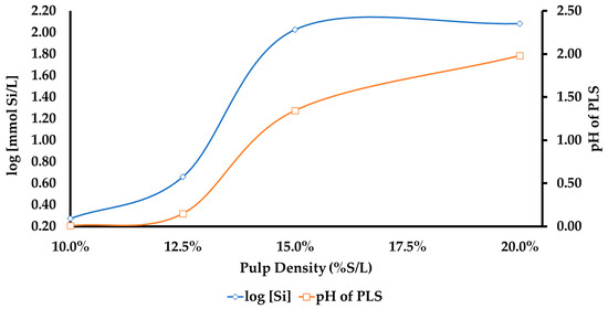 Logarithm of Si concentration in the PLS and pH value of the PLS after filtration as a function of the S/L ratio. Graph data shown in Table 4.