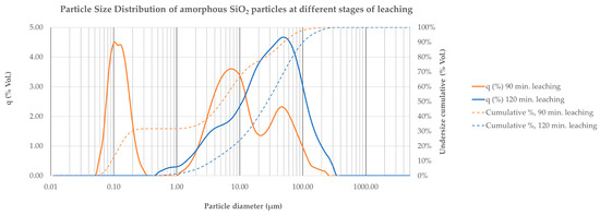 Particle size distribution analysis of the amorphous SiO2 residues at 90 min and 120 min of leaching. Leaching conditions: 80 °C, 1 atm, 20.2% wt. aqueous HCl solution, 15% S/L, 120 min, 300 rpm.