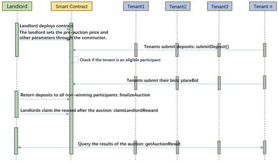Table 2 and Figure 2 describe the functions used to implement the proposed algorithm to implement a range price auction process converted into a smart contract. The developed smart contract can be found in the GitHub repository. By comparing the smart contract Solidity code and Algorithm 3 explanation in Figure 3 in the GitHub repository, one can gain a complete understanding of Algorithm 3 and its significance in the code. Furthermore, the sequence diagram depicted in Figure 4 captures the interactions among different stakeholders. Each participant in the blockchain network holds an EA, enabling them to interact with each other by invoking the designated functions as illustrated in Table 2 Firstly, the landlord must provide details such as the start time, end time, and deposit before the smart contract is created, as shown in Figure 4. Tenants then submit their deposits using the submitDeposit() function. Subsequently, eligible tenants engage in range price bidding by calling the placeBid() function. Tenants use the finalizeAuction function to refund deposits to all unsuccessful participants. If a tenant wishes to withdraw his/her deposit at a different time during the auction, he/she can utilize the withdrawRefund() function. Only after the auction concludes can the landlord claim his/her reward by invoking the claimLandlordReward() function. After the auction ends, anyone can call the getAuctionResult() function to view the winning bid.