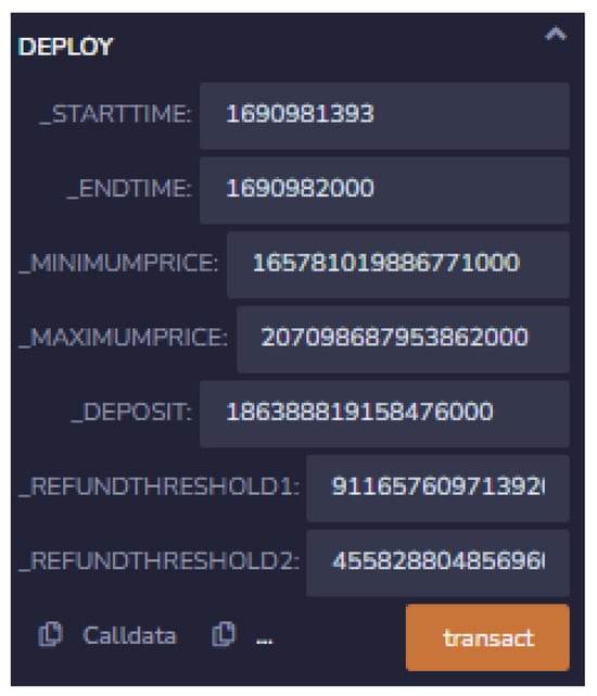 Start time (STARTTIME): The commencement time of the auction, calculated using Solidity’s Unix Epoch time. End time (ENDTIME): The conclusion time of the auction, likewise calculated using Unix Epoch time. Minimum acceptable value (MINIMUMPRICE): (The unit we used in this process is gas). The minimum bid amount the landlord is willing to accept. Maximum acceptable value (MAXIMUMPRICE): The maximum bid amount the landlord is willing to accept. Deposit amount (DEPOSIT): The deposit amount tenants need to submit before participating in the auction to demonstrate their serious intent. Additionally, the landlord is required to manually configure refund thresholds, namely the following two thresholds: