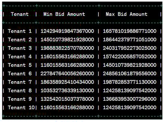 During our auction testing phase, we simulated ten tenants, each assigned a range of maximum and minimum bid amounts they were willing to pay (The unit we used in this process is gas). Figure 6 displays the simulated scenarios of these tenants, representing various bidding strategies.