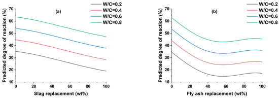 The effect of w/c ratio on the DOR of SCMs is shown in Figure 2. A broad range of w/c ratios were employed to assess their influence on the properties of the cementitious material. This was undertaken primarily to offer a comprehensive perspective on the behavior of the material across varying w/c ratios, which is crucial for a thorough understanding of its performance. The decision to employ a high w/c ratio was based on specific considerations aimed at simulating conditions relevant to practical applications. In certain real-world scenarios, particularly in construction projects or concrete formulations, a high w/c ratio is indeed employed to achieve the desired workability, improve flow, and ensure ease of placement. This is because a higher w/c ratio makes the concrete more fluid and easier to deal with, which can be helpful when pouring concrete into intricate molds or navigating through complex constructions [55]. Moreover, this approach is often favored when time is a critical factor, as it can expedite the pouring and setting processes, allowing for more efficient progress on the construction site. Additionally, a high w/c ratio may be necessary when the SCMs used have very fine particles [56]. For all SCMs, the DOR increases with increasing w/c ratio, similar to previous studies [57,58], with the main variances arising from the SCMs replacement content. Although these variations are not directly related to the w/c ratio, they may be used to compare the DOR with the major inputs included in the model and are thus described. The DOR of slag constantly decreases when its replacement is increased. This is due to a decrease in the alkaline activating environment created by cement hydration [58]. The DOR of fly ash can be clearly described by dividing it into four zones, the first being a 0–50% replacement of PC, where the DOR falls significantly, the second replacing from 50 to 60%, where the DOR remains constant, the third from 60 to 95, where the DOR rises slightly, and finally from 95 to 100% where the DOR remains constant. The DOR of fly ash initially demonstrates a decreasing trend, potentially due to factors such as the characteristics of the fly ash, its pozzolanic reactivity, cementitious system composition, and curing conditions. As the replacement level of fly ash increases, the available reactive compounds may become saturated, resulting in the observed decrease in DOR. However, as the replacement level continues to rise, other influencing factors come into play, such as improved dispersion of fly ash particles and extended reaction time. These factors can contribute to a subsequent increase in the degree of reaction, countering the initial decrease observed in DOR. The DOR of metakaolin slightly decreases up to 10% replacement of PC and then drops significantly up to 80% replacement, and then remains constant. The DOR of silica fume significantly drops up to 78% replacement of PC, after which it remains constant.