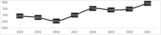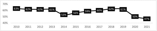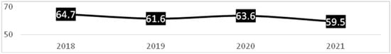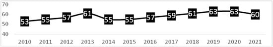 The conditional coverage level presented in Figure 9 is calculated as the ratio of the number of students to the average number of individuals aged 17–22 years and corresponds to the value r in Formula (9). As mentioned, due to the presence of individuals over the age of 22 among the students of higher education institutions and depending on their relative weight, the actual coverage level of the group of students aged 17–22 by higher education will be slightly lower than the simple ratio of the number of students to the population of this group.