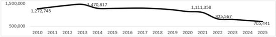 The assumptions and forecasted data regarding the size of age cohorts in the forecast period allowed us to use Formulas (4), (7), and (8) to calculate the average annual number of students in vocational education institutions during the forecast period. Migration is almost identical to its impact on general education: students are more likely to continue their education in a distance learning mode. The results of these calculations are given in Table 2 and presented in Figure 8.