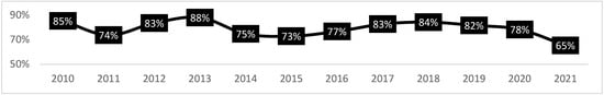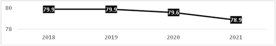 The study of the dynamics of the ratio of the number of students enrolled in higher education institutions (HEIs) according to the size of the x18 age cohort (i.e., the γ coefficient in Formulas (10) and (12)) during the forecast period shows that this value gradually increased until 2018 and then decreased from 2019 to 2022 to an average level of 77% (Figure 10). It should be noted that interpreting this fact as meaning that 77% of 17-year-olds enroll in HEIs would be incorrect since although such individuals make up most HEI applicants, there is a specific and significant percentage of applicants who belong to other age cohorts. Instead, the reference to this cohort is explained by the fact that it determines the dynamics of the number of applicants. For the forecast period, we fixed the value of the γ coefficient at 77%.