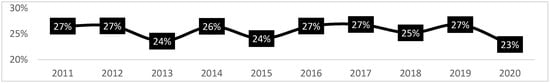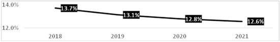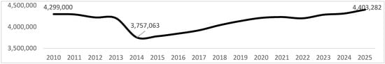 The value of another critical variable-η from Formulas (11) and (12), which is directly related to the average duration of study in higher education institutions, also demonstrates stable behavior in recent years of the base period (Figure 11). Taking this into account, for the forecast period, we assumed that η is equal to 25%, or equivalently, that the average duration of study in higher education institutions would be four years.