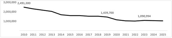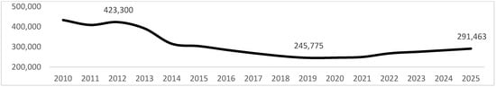 Over the past few years, the number of young people attending higher education institutions has been rapidly increasing due to several factors: an increase in the demand for specialists with higher education qualifications in the labor market, an increase in the income of the population, and, accordingly, the possibility of obtaining higher education on a fee-paying basis, as well as an increase in the number of educational institutions while simultaneously increasing the number of places in such institutions. However, over the past two years, there has been a decrease of 47–50%. We assume that in the future, the influence of some of these factors will strengthen while others will weaken. In particular, an increase in the population’s income and a decrease in the number of young age groups (with many places available in higher educational institutions) will make higher education more accessible. However, an increase in the supply of specialists with higher education in the labor market will decrease their comparative “value” and, thus, decrease the interest of young people in obtaining higher education. As a result, the level of young people with higher education will stabilize at around 45–50% (Figure 9).