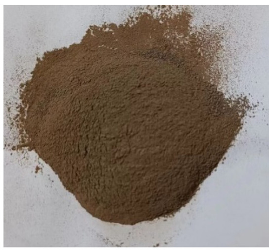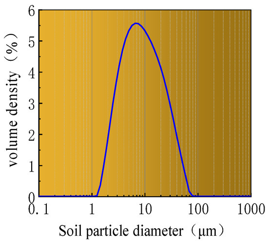 The soil sample used in the test was selected from the silt soil of a pond in Henan Province. The morphology of the test soil sample is shown in Figure 2, and its chemical composition is shown in Table 1 below. The soil samples were put into the oven to dry after grinding through a 2 mm sieve spare, using a Mastersizer 2000 laser (Marvin Instruments Limited, Worcestershire, UK) particle size analyzer to determine the particle size composition of soil samples. The particle size distribution of soil samples is shown in Figure 3. The plastic limit and liquid limit of the soil sample were measured using a digital liquid plastic limit tester. The liquid limit wL = 40.3%, the plastic limit wP = 27.1%, the plastic index IP = 13.2, and the specific gravity was 2.60.