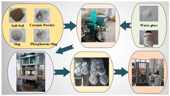 At present, most research is based on preparing curing agents using cement [25,26]. There are relatively few studies on using solid waste materials as curing agents. In this study, based on all uses of solid waste materials, a ceramic powder–slag–phosphorus slag multi-system was used to reinforce muddy soft soil. Firstly, the optimal ratio of inorganic binder was determined using an orthogonal test in which the 7-day unconfined compressive strength was determined. The effects of the initial water content, curing agent content, admixture type, and admixture content on the mechanical properties of solidified soil were investigated. Finally, the mechanism by which ceramic powder–slag–phosphorus slag acts as a curing agent to strengthen soft soil was analyzed using SEM and XRD, which can provide a theoretical basis for practical engineering applications of the new soft soil curing agent CSP. The research flowchart of this article is shown in Figure 1.